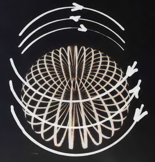 3 - Quantum Torus Fields - In the case of Protons, Electrons, Neutrons and Neutrinos, the closed Torus Fields are looping bonded magnetic Strings, Threads, Rope size fields of Universal Particles, that loop thru a center axis. (pole to pole to pole chains). This gives it a Horn Torus structure, therefore, the name of the fields should be Torus Fields. (a) The internal closed Torus fields of the Proton, all have the same relative spin energy, cw. The closed Torus fields of the Electron spin ccw. The Neutron and Neutrino have both cw and ccw closed torus loops. This is what gives these particles their respective charges. (b) Structure's like atomic nuclei, also create torus fields because of their spin energy. In other words all spinning body's larger then dark matter particles, because they are surrounded by a spatial medium, they produce whirling Torus and Ring Fields, open and closed with a magnetic streaming spin and flow. The Torus Field energy, is produced by the spinning body's axis. These polar fields, once established and extended, will bend inward seeking closure. This phenomena is what creates an axis point for the fields and not a spinning particle nucleus. (c) (*) One more important fact about Torus Fields, they have a one way Magnetic flow. In other words they produce a streaming, polarized, flowing magnetic spatial force. We are not done yet, Encyclopedia 100 has more facts about Torus fields to discover.